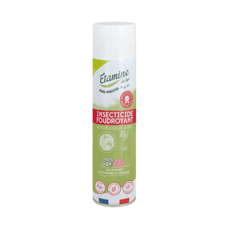 Éliminez efficacement et rapidement tous les insectes indésirables de votre maison grâce à cet insecticide foudroyant à base de molécules d’origine naturelle. Sa formule puissante associe le pyrèthre (extrait de fleurs de chrysanthème), un insecticide naturel qui agit directement sur le système nerveux des insectes, et le géraniol, un répulsif d’origine végétale qui éloigne les nuisibles et limite leur retour dans le temps.