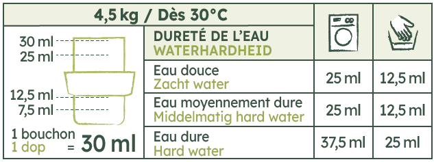 Lave-linge : 25 ml. Sèche-linge : 15 ml sur un torchon humide. Ne tache pas. Suivre les indications de lavage inscrites sur l’étiquette des textiles. Pour respecter l'environnement, faire tourner votre lave-linge à pleine charge, privilégier les cycles de lavage à basse température, et suivre les instructions de dosage.