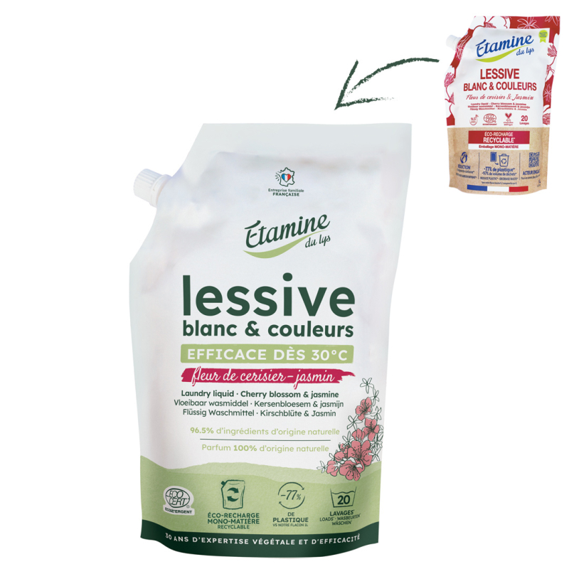 Choisissez de la douceur pour votre linge tout en réduisant votre impact environnemental avec l’éco-recharge lessive Fleur de Cerisier & Jasmin Etamine du Lys. Conçue pour recharger facilement votre flacon, elle offre une solution pratique, économique et responsable, sans compromis sur l’efficacité ni sur le plaisir du parfum.