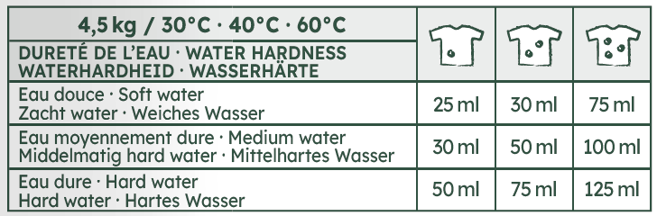 Voir tableau de dosage. Entre 30ml et 125ml selon le degré de saleté du linge et la dureté de l’eau.