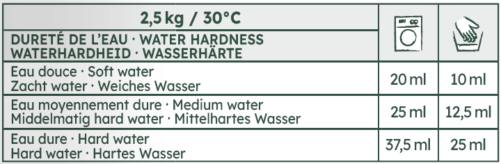 Entre 10ml et 37,5ml selon la dureté de l’eau et selon le type de lavage (machine ou lavage à la main). Pour une 1/2 charge, diviser les doses par 2. Suivre les indications de lavage inscrites sur l’étiquette des textiles. Pour respecter l'environnement, faire tourner votre lave-linge à pleine charge, privilégier les cycles de lavage à basse température, et suivre les instructions de dosage.