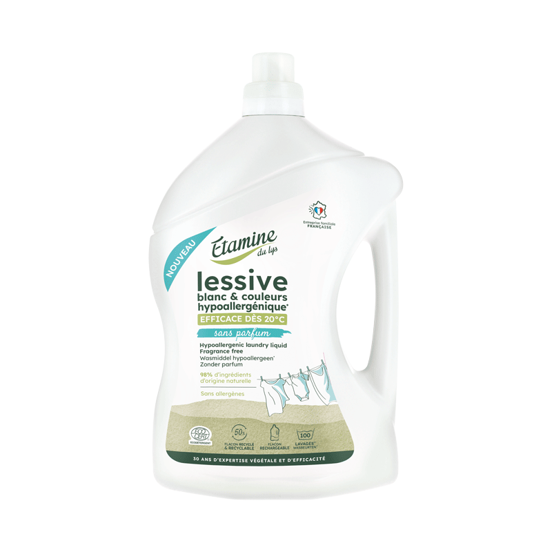 Offrez à votre linge une propreté impeccable et une douceur inégalée avec notre lessive hypoallergénique sans parfum Etamine du Lys, disponible en format familial 3L, idéal pour un usage régulier et économique. Spécialement formulée pour respecter les peaux sensibles – y compris celles des bébés – cette lessive est testée sous contrôle dermatologique et ne contient ni parfum, ni allergènes, ni substances controversées.
