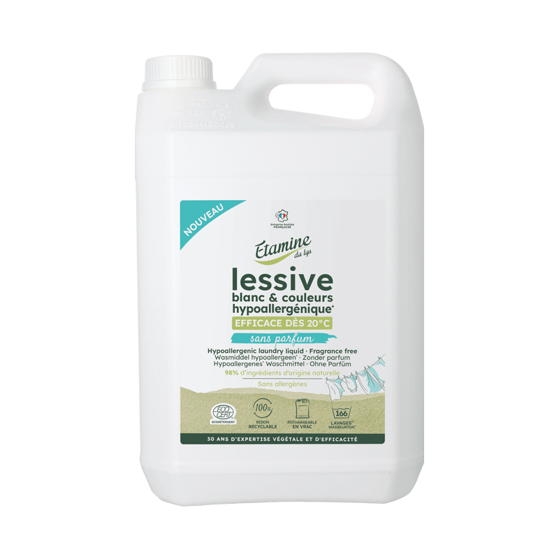 Offrez à votre linge une propreté impeccable et une douceur inégalée avec notre lessive hypoallergénique sans parfum Etamine du Lys, disponible en grand format 5L, idéal pour un usage régulier et économique. Spécialement formulée pour respecter les peaux sensibles, y compris celles des bébés, cette lessive est testée sous contrôle dermatologique et ne contient ni parfum, ni allergènes, ni substances controversées.