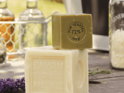 5 -15% : savon à base, entre autre, d'huiles d'olive** et de lin**. Contient aussi : eau, sels de carbonates, caramel**, séquestrant.