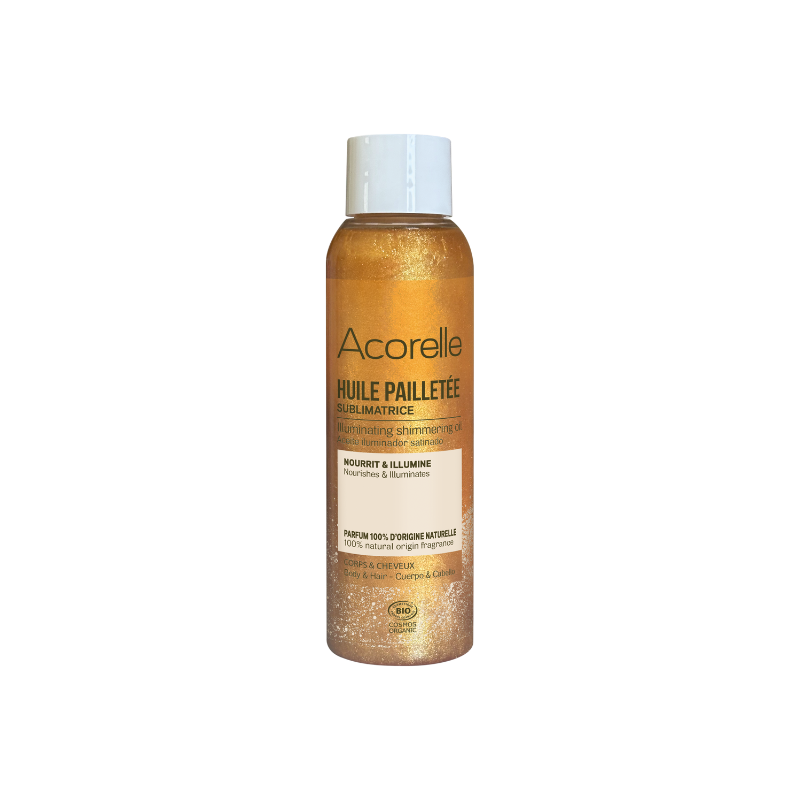 L’Huile Pailletée sublimatrice nourrit et illumine en un seul geste le corps et les cheveux.